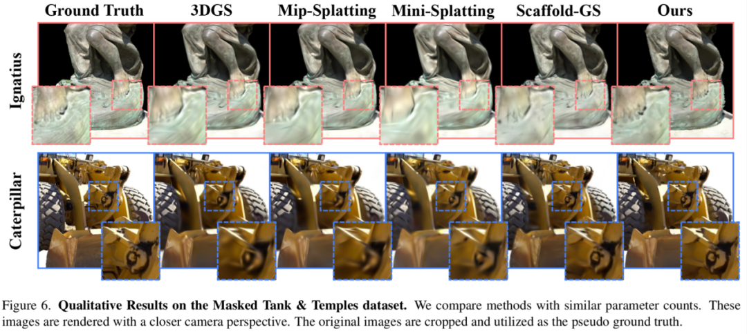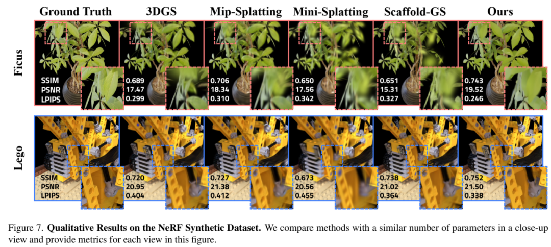 实验结果表明,BG-Triangle 在边界清晰度 和 参数效率 方面表现优越。相比 3D Gaussian Splatting(3DGS)、Mip-Splatting、Mini-Splatting 和 Scaffold-GS,能以 极少的图元数量 实现更高质量的渲染。在相似参数规模下,BG-Triangle 在 LPIPS 评分(感知质量)上显著优于其他方法,且在放大渲染中仍可保持清晰的物体边界,而 3DGS 及相关方法在近距离观察时会产生模糊或伪影。