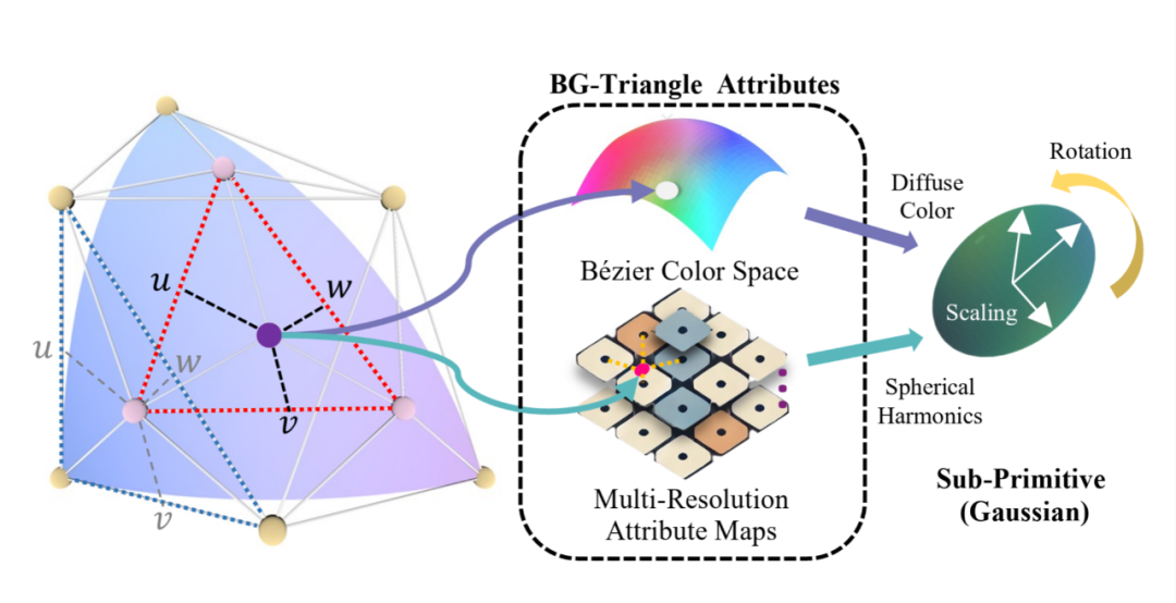 BG-Triangle 图元还编码了高斯的参数属性,包括形状、大小和颜色等信息。利用这些属性,可以在图元内自由生成用于渲染的高斯分布。这些高斯的位置与控制点相绑定,从而使图元具备可微特性。
