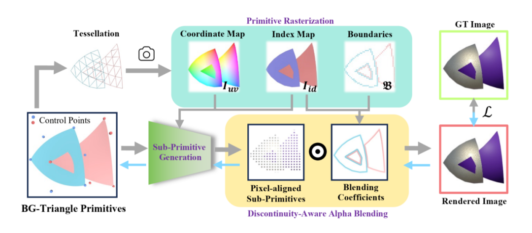 BG-Triangle 的渲染管线分为两个部分。第一部分将图元渲染为目标视角下的图形缓冲区,该缓冲区包含非连续感知渲染所需的信息。这一部分可通过现有的图形光栅化管线实现。第二部分利用缓冲区信息生成像素对齐的高斯分布,并根据边界进行渲染。在此过程中,梯度通过第二部分的高斯生成模块直接传递到贝塞尔三角形图元上。具体的梯度公式推导详见原文附件,供感兴趣的读者参考。