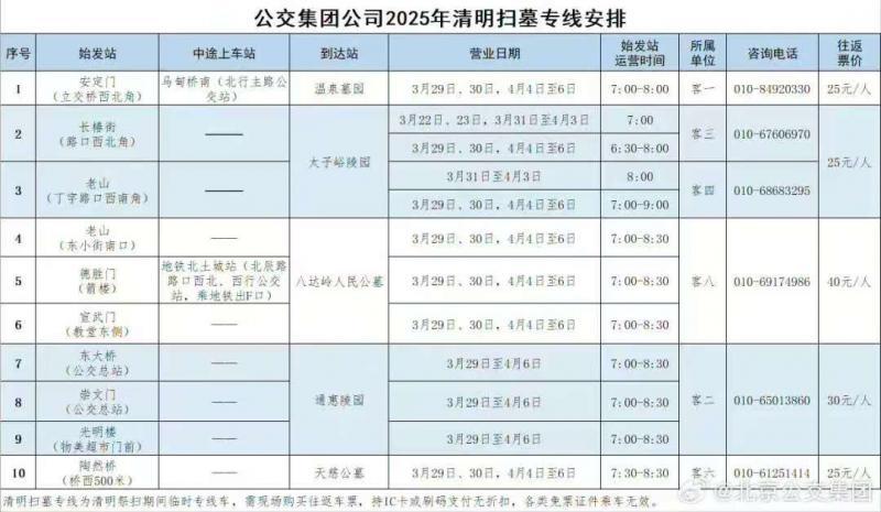 10条清明扫墓专线的始发站分别在长椿街、安定门、老山、德胜门、宣武门、东大桥、崇文门、光明楼、陶然桥,其中老山始发站涉及两条专线,一条开往太子峪陵园,另一条开往八达岭人民公墓。
