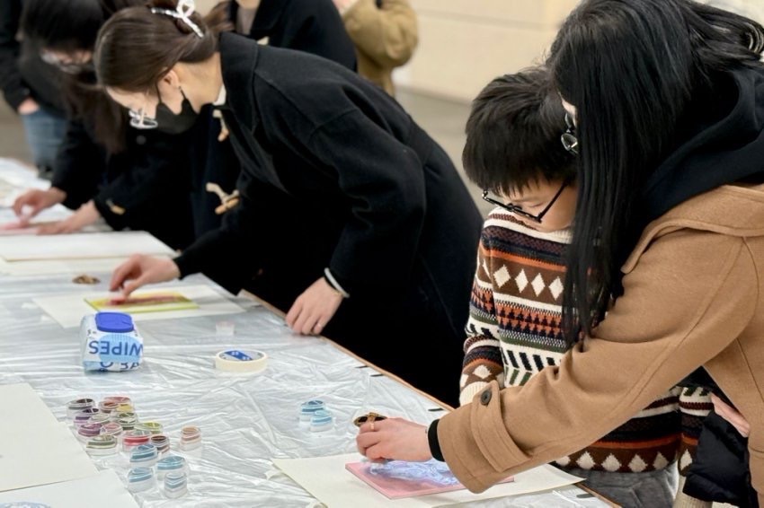 在 “星光云水 —— 星云大师的笔墨情怀主题书法展”展厅,配套的 “ 星光云水”拓印体验活动在“城市美育日”迎来全新升级,中华艺术宫(上海美术馆)与上海师范大学天华学院馆校合作推出的一组全新木刻板,围绕星云大师作品创作而来,将油墨涂抹在图案上,经宣纸覆盖、按压,一幅幅充满大师笔墨韵味的拓印作品便跃然纸上。 “就是来这里吸收正能量的。”参与者边拓印边这样告诉记者。