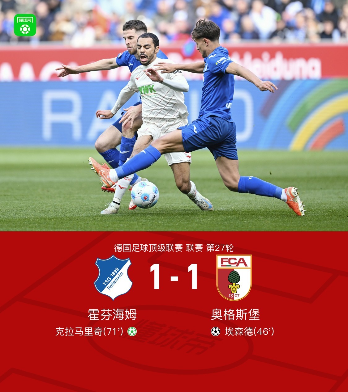 德国足球顶级联赛第27轮,霍芬海姆主场迎战奥格斯堡。比赛中,奥格斯堡由埃森德率先取得进球,为球队打破僵局。随后,霍芬海姆依靠克拉马里奇的点球机会将比分扳平。最终,双方以1-1的比分结束比赛。