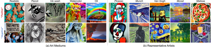 Emotion Adapter 不仅适用于图像编辑,还可拓展至风格图像生成。通过一次训练,它即可将情感极性(积极、消极)编码为准确、多元的语义表示。例如,在 「莫奈」风格生成的图像中,「日落」唤起「敬畏」(积极),而「墓地」则传递 「悲伤」(消极),充分展现了其在风格图像生成任务中的鲁棒性。