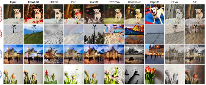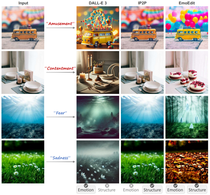 然而,这两者本质上存在一定冲突,如何权衡成为关键挑战。尽管当前先进的生成模型在图像编辑任务中表现出强大能力,但难以权衡结构保持和情感唤起(如下图所示)。现有方法主要依赖颜色调整或风格变化进行情感迁移,但情感表达仍不够精准和显著,难以呈现更丰富且生动的情感效果。