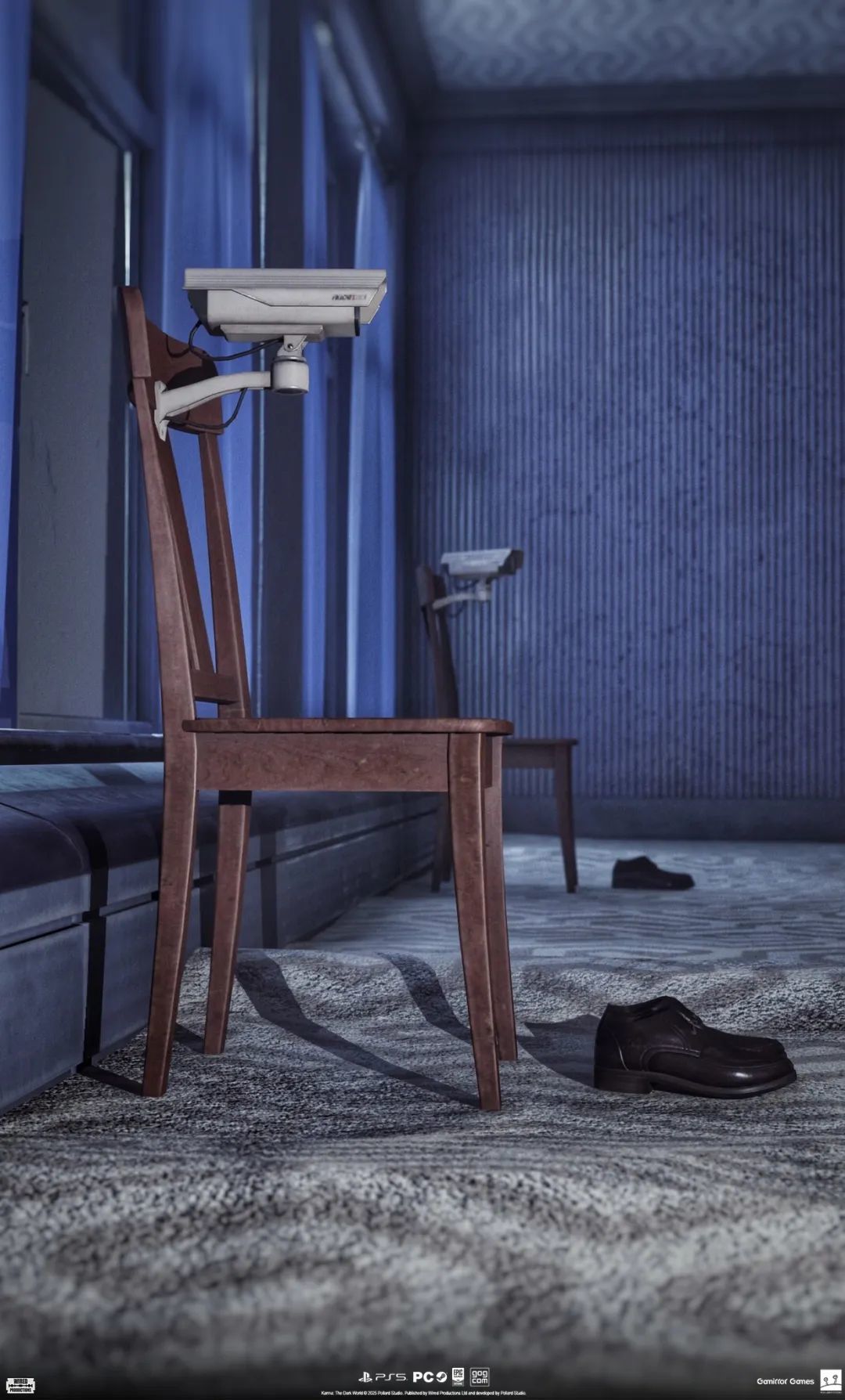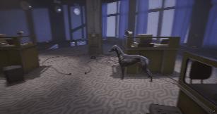 工位旁的狗在疯狂摇头,它代表着一种非常不安定的状态;工位后方的凳子前,放着皮鞋,上有摄像头。或许并没有人坐在凳子上,但它仍能传递一种压迫感,好像在你没发现的角落里,总有人在24小时监视着一切。