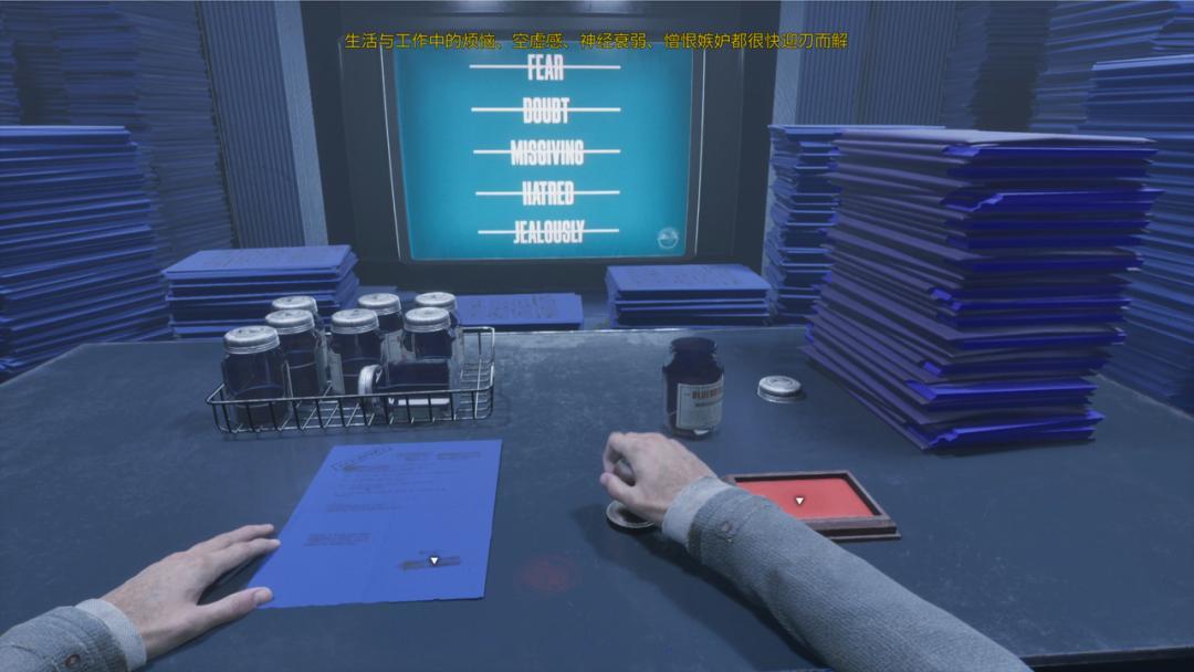 陈绿:在堆满文件的蓝色房间里,你不断工作,喝着小蓝瓶强撑意识、避免崩溃,面前的广播吹嘘着小蓝瓶的功效,但时不时也会闪过“别喝了”的警告。它是一个强调压抑、无奈的场景——你内心明知小蓝瓶会对身心造成伤害,但为了工作又不得不喝。