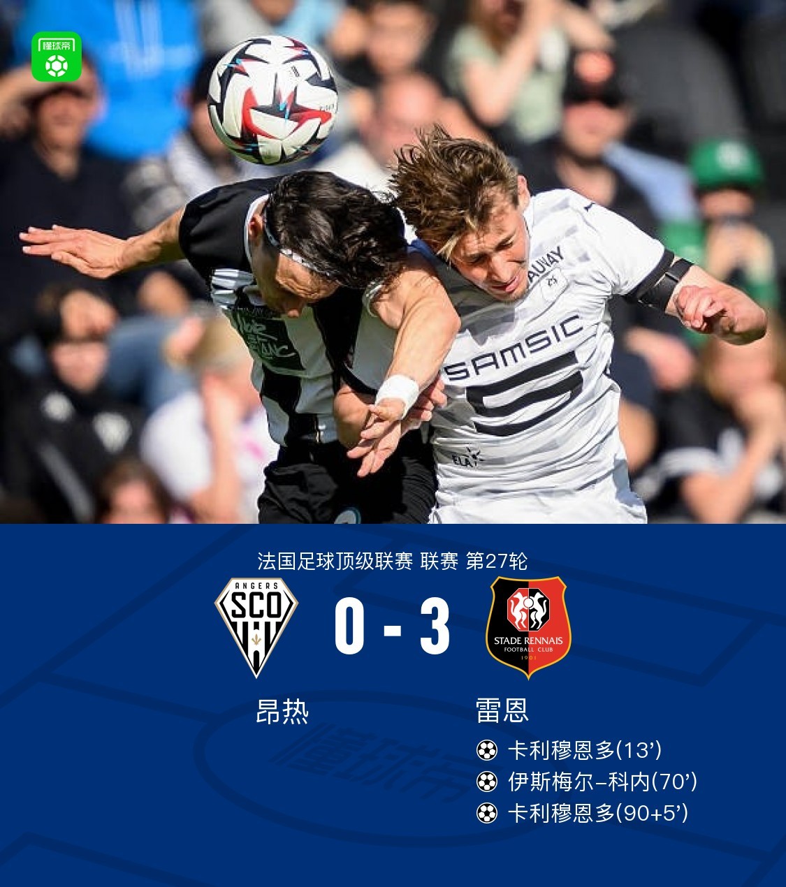 北京时间3月30日,法国足球顶级联赛第27轮,昂热主场迎战雷恩。比赛中,雷恩展现出强劲的进攻实力,卡利穆恩多打入两球并贡献一次助攻,伊斯梅尔-科内则在另一关键时刻完成破门,为球队锁定胜局。最终,雷恩以3比0战胜昂热,全取三分。