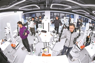 本市首家人形机器人数据训练中心日前在石景山首钢园科幻产业集聚区二期揭牌落地。这里被誉为人形机器人训练“学校”,引入教师对机器人进行训练。图为在数据采集师的指导下,机器人正在进行抓瓶子等复杂操作。详见06版 摄影/本报记者 付丁