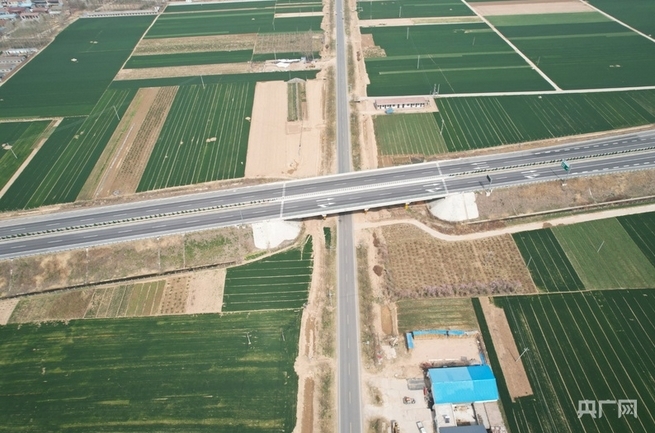 从空中俯瞰,兰原高速(横向)与鲁陈路(纵向)成十字形(央广网发 赵梦阳 摄)