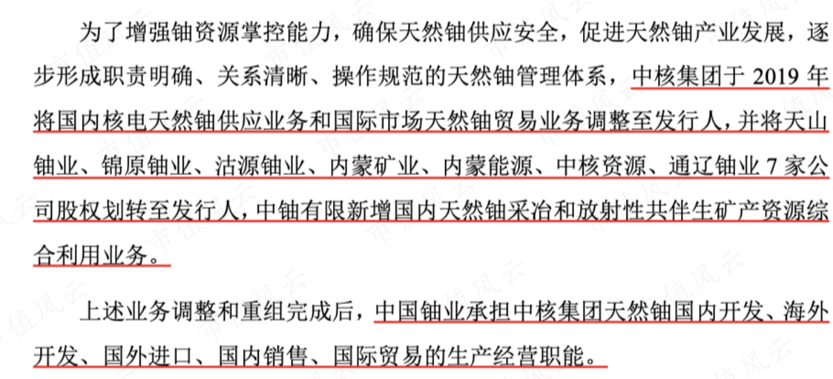 此外,在准备上市过程当中,中国铀业2018年改制成有限公司之后,估计为了避免后续上市同业的竞争问题,实际控制人中核集团2019年就将所有的铀矿资源和国内外贸易业务都交给了中国铀业。