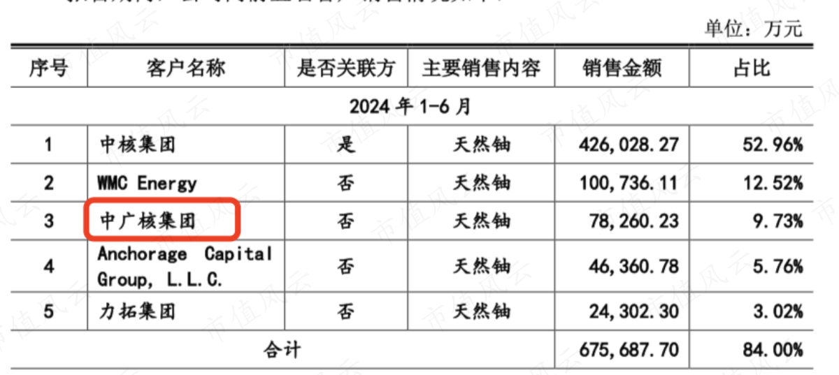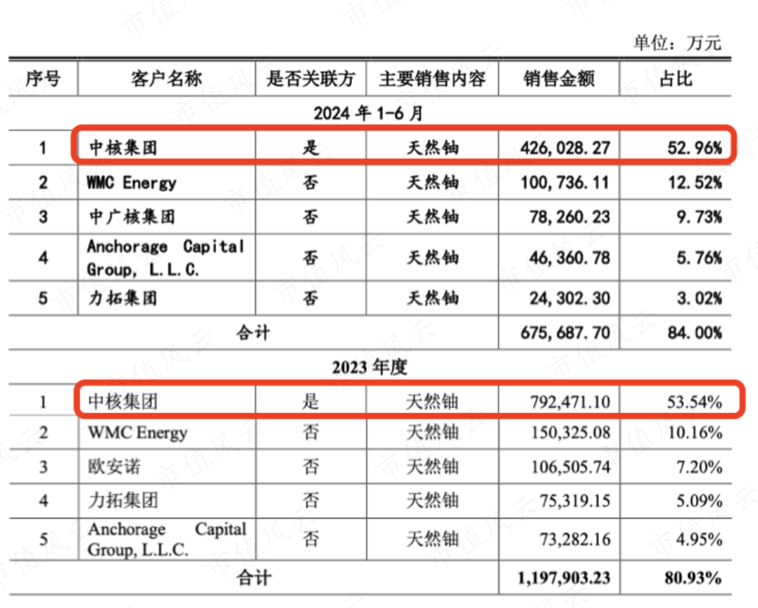 而中核集团也是中国铀业的第一大客户,2021年2024年中,中国铀业向中核集团关联方的销售额分别为58.2亿、50.6亿、79.2亿和 42.6亿,占当期营业收入的比例分别为65.36%、48.02%、53.54%和52.96%。