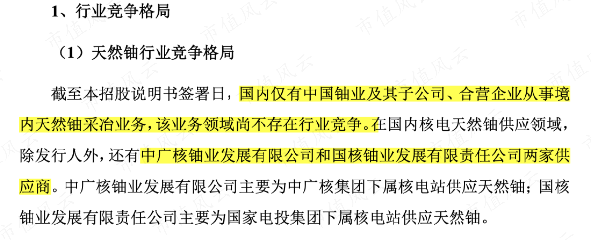 所以铀矿行业有一点特别好,就是这个业务不存在行业竞争,只有三家公司:(1)中核集团旗下的中国铀业;(2)中广核集团旗下的中广核矿业(1164.HK);(3)国家电投旗下的国核铀业。
