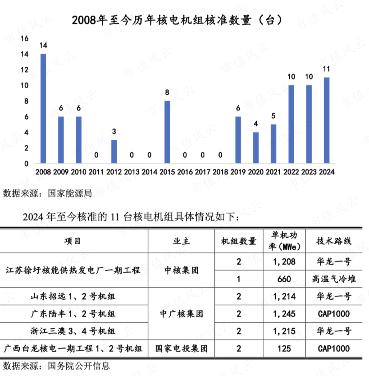 需求方面,2019年之后中国重启核电核准,2022年-2024年,国务院常务会议相继核准10台、10台及11台核电机组开工建设,近年来核准机组数量大幅增加。