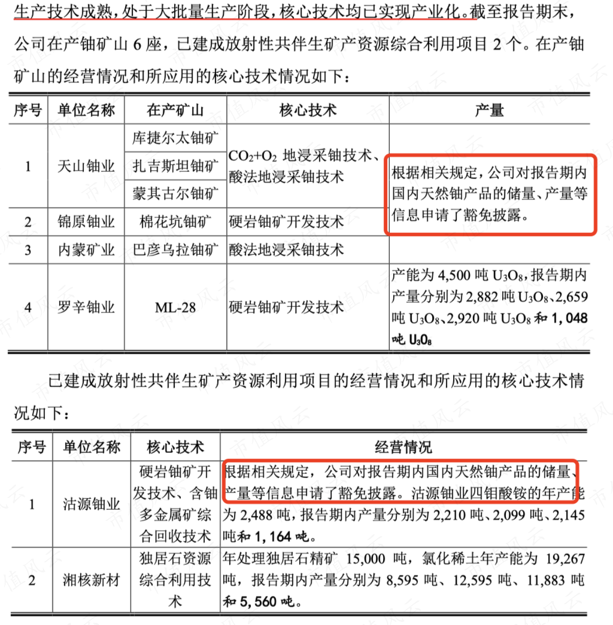 总的储量和产量方面,中广核矿业披露了2023年中广核矿业权益资源量为3.9万tU,权益产量为1227tU,不过中国铀业基于相关规定,申请豁免不披露具体的储量和产量。