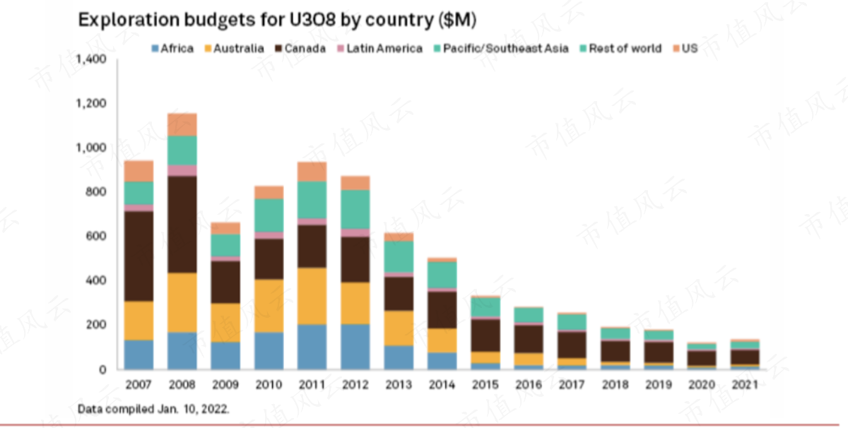 供给方面,资本支出不足,全球各国天然铀勘探支出下降明显。