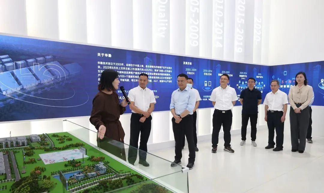 沙田镇党政代表团一行在东坑镇党委书记谭全河,镇党委副书记、镇长蔡国威等的陪同下,首先来到广东东勤科技有限公司,以听取介绍、参观展厅的方式,详细了解东勤公司的核心技术、产品研发及市场布局等情况。