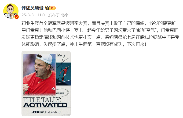 知名体育评论员詹俊在个人社媒点评本场比赛时写道:职业生涯首个冠军就是迈阿密大赛,而且决赛击败了自己的偶像,19岁的捷克新星门希克!他和巴西小将丰塞卡一起今年给男子网坛带来了“新鲜空气”,门希克的发球更稳定底线和网前技术也更扎实一点。德约两盘抢七局在底线拉锯战中还是受体能影响,失误多了点,冲击生涯第一百冠没有成功,下次再来!