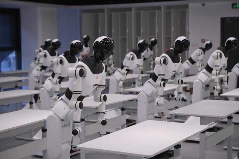 走进人形机器人学校,最醒目的是一间超700平方米的“大教室”。在教室内,整齐地布设了上百张桌子,桌子上摆放着饮料瓶、纸巾、毛绒玩具等教学用具。目前有80个人形机器人“学员”已经到位,站在桌子旁时刻等待着老师进行系统培训。