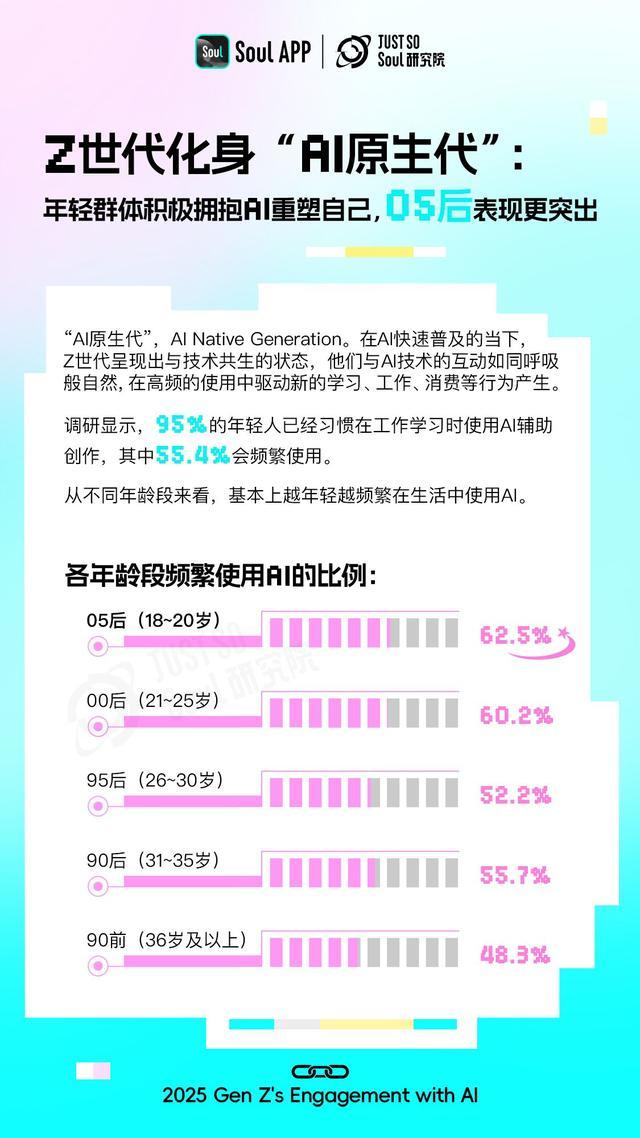面对这些新问题,在去年发布《2024 Z世代AIGC态度报告》(样本数3457份)后,时隔将近一年时间,Soul App旗下Just So Soul研究院再次面向年轻群体发起AI相关调研,共回收3680份有效反馈,并将结果梳理总结为《2025 Z世代AI使用报告》。该报告聚焦年轻人对AI认知和使用的改变,以及这种变化背后个体如何重塑与新技术相处的范式。