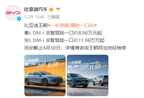 红星资本局3月31日消息,3月29日,比亚迪(002594.SZ)汽车在微博发布消息,宣布针对王朝网部分车型非智驾版本推出限时“一口价”活动。其中,秦L DM-i非智驾版起售价官降1万元至8.98万元;宋L DM-i非智驾版起售价官降1.6万元至11.98万元。