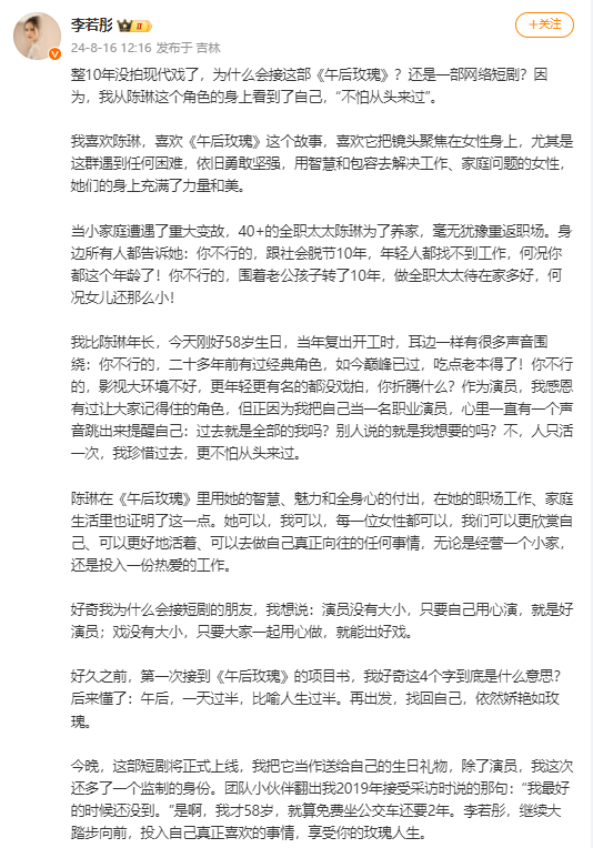 2024年8月16日,李若彤在生日当天在个人微博发布长文,为自己主演的这部网络短剧《午后玫瑰》宣传。在解释自己为何接演这部剧时,李若彤表示:在角色身上看到了自己,“不怕从头来过”。