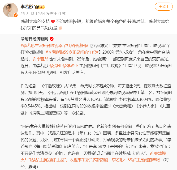 近日,曾在2000年凭“小龙女”一角在全中国声名鹊起的李若彤,在2025年通过一部短剧再度迎来自己的荧屏高光。其主演的短剧《午后玫瑰》“上星”卫视,收视率力压同时段大部分传统电视剧,引发广泛关注。