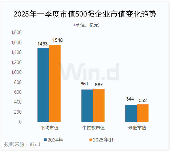 2025年一季度市值500强企业平均市值、中位数市值和最低市值分别为1548亿元、667亿元和352亿元,较2024年分别增长65亿元、16亿元和8亿元。