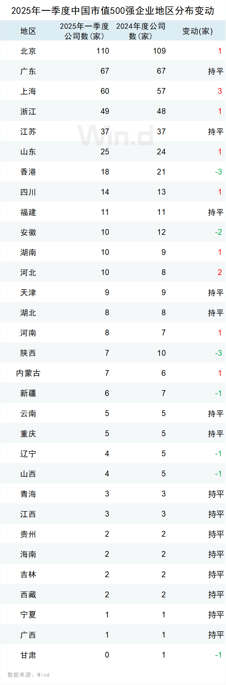 从市值500强企业注册地分布来看,2025年一季度北京、广东、上海位列前三位,分别有110家、67家和60家,其中,北京增加1家,广东持平,上海增加3家。