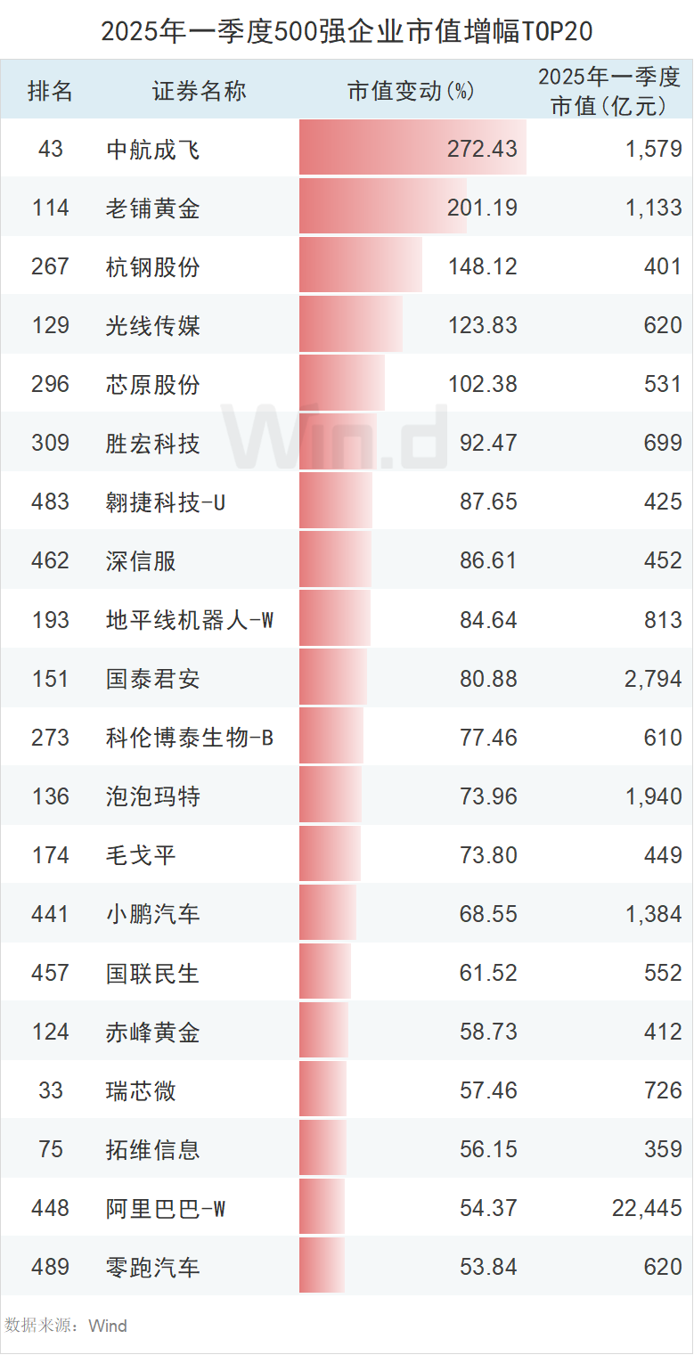 2025年一季度多数500强企业市值较2024年增幅明显。中航成飞市值增幅达272.43%,位居首位;老铺黄金、杭钢股份、光线传媒、芯原股份等公司市值相比2024年增长均超过100%。