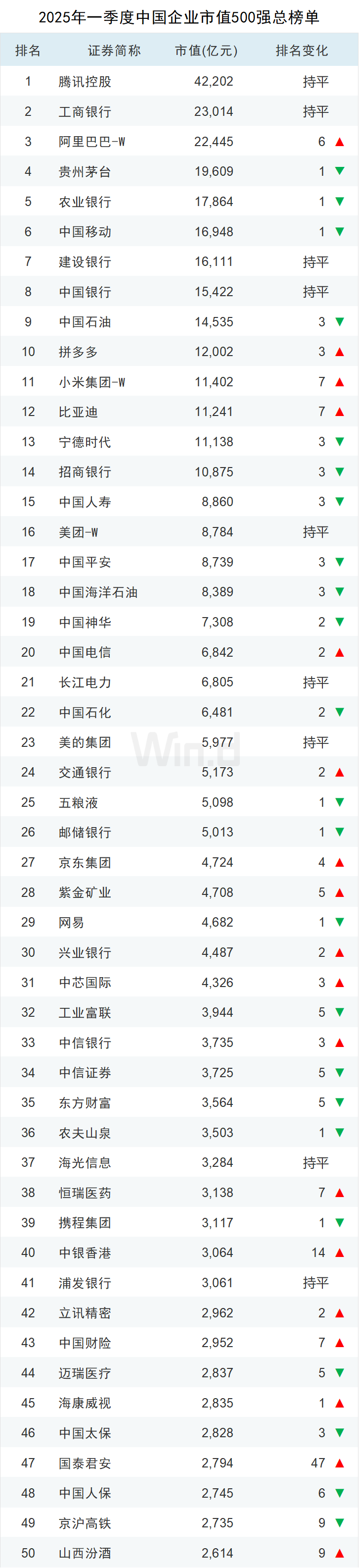 Wind最新发布2025年一季度“中国上市企业市值500强”榜单,腾讯控股、工商银行、阿里巴巴位列市值榜前三名。市值超1万亿元的企业有14家,较2024年底增加4家。市值超万亿企业中,阿里巴巴、拼多多、小米集团、比亚迪排名均有所提升。