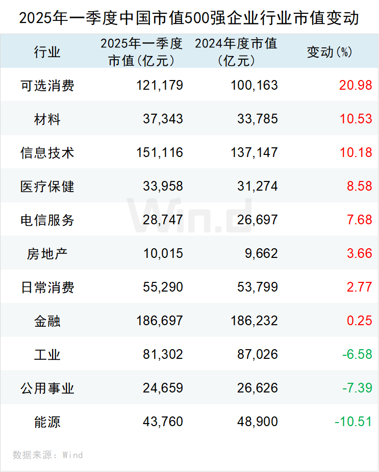 从市值500强企业行业市值变动来看,2025年一季度有8个行业市值增加,3个行业市值减少。其中,可选消费行业总市值增长20.98%,达121179亿元;材料和信息技术板块市值相比2024年分别增长10.53%和10.18%;能源、公用事业、工业板块市值相比2024年分别减少10.51%、7.39%和6.58%。