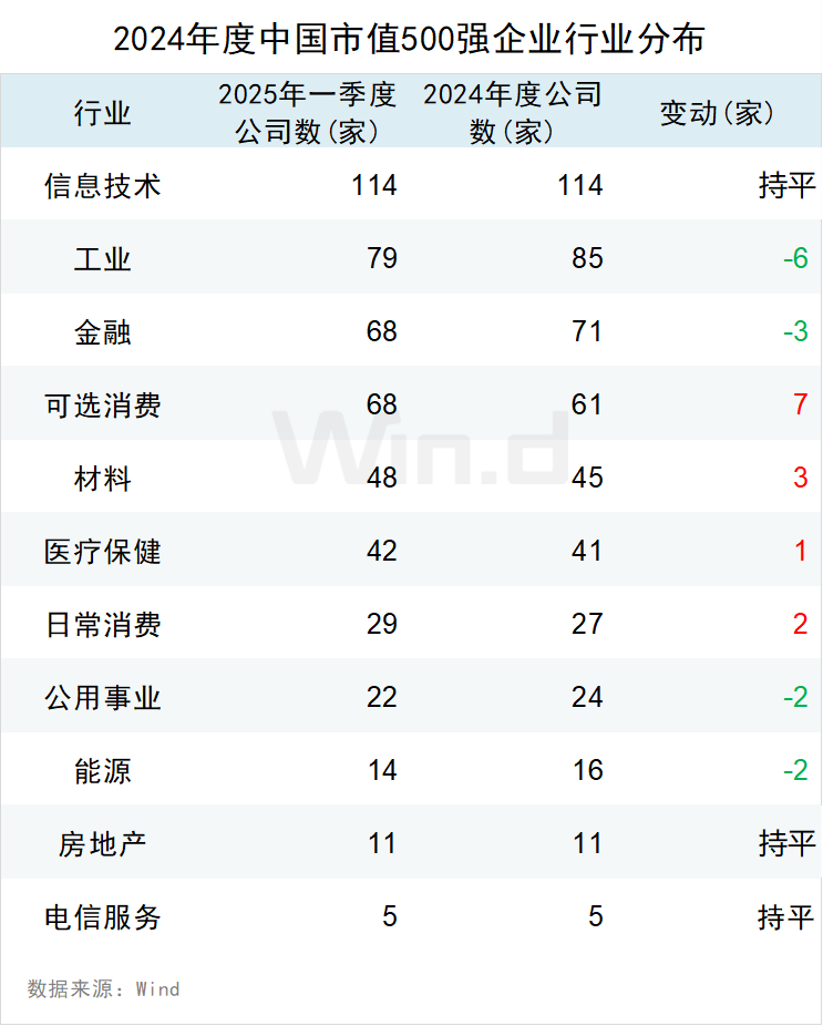 2025年一季度从市值500强企业行业公司数排名来看,其中,信息技术板块500强企业数量为114家,相比2024年持平;工业板块企业数量为79家,相比2024年减少6家;金融板块企业数量为68家,相比2024年减少3家。
