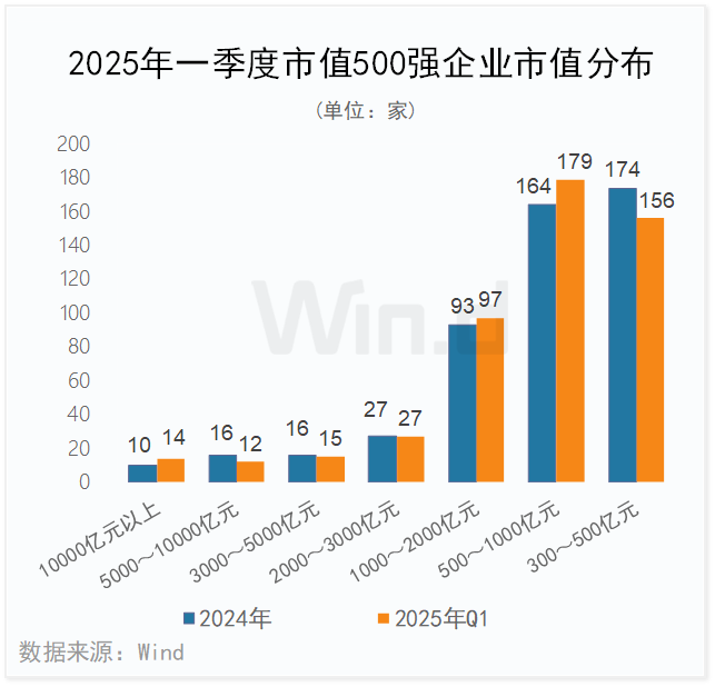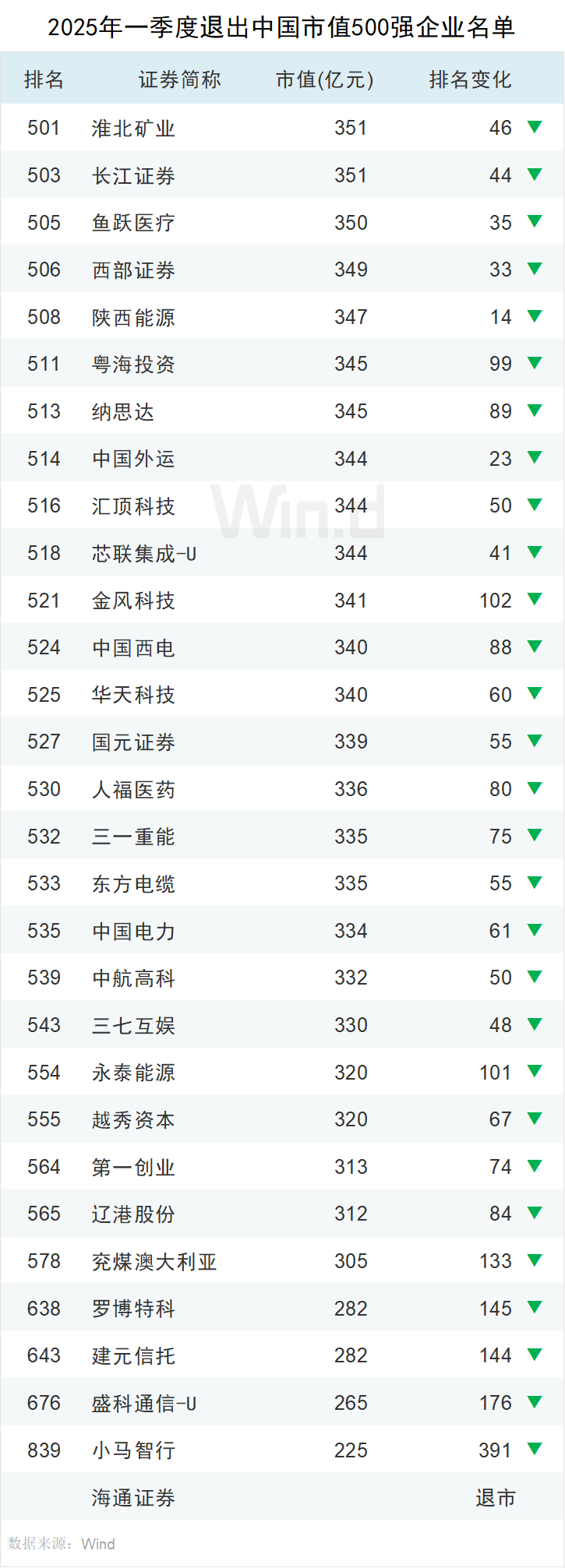 2025年一季度共有30家企业退出市值500强行列,行业风向转变和股价下跌导致部分公司市值快速缩水。