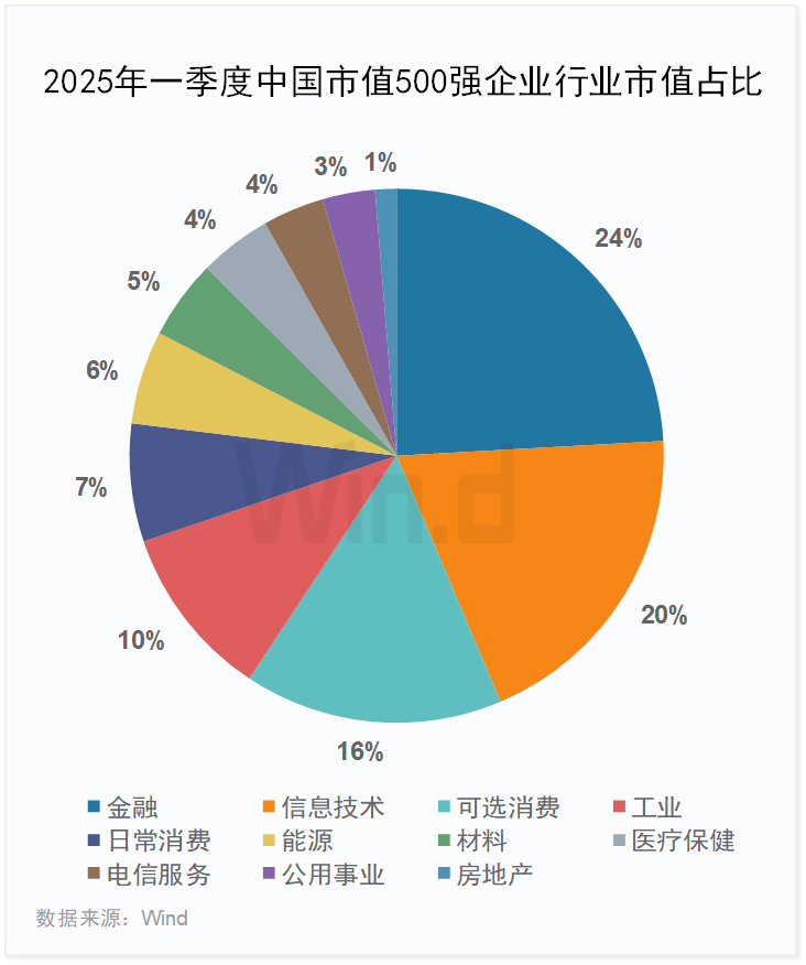 2025年一季度市值500强企业行业市值占比前三名分别为金融、信息技术和可选消费,金融业市值占比最高,达24%。