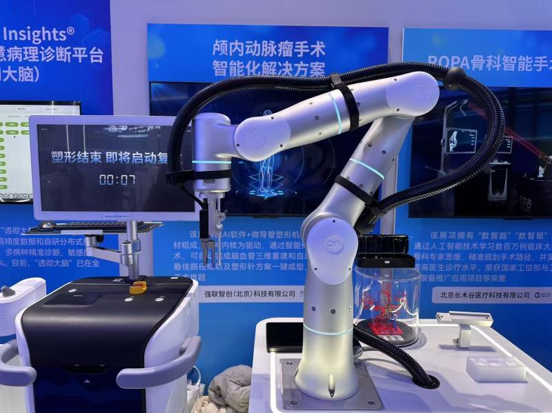 “颅内动脉瘤手术的难点在于脑血管又细,弯曲度又非常复杂,之前医生需要靠前期检查和丰富的经验来自制微导管。”强联智创展台工作人员展示了一根根细如铁丝、被弯转成各种形态的微导管。“但是我们这套设备能利用计算机和AI技术自动对脑动脉瘤介入手术进行规划,其核心是提供微导管塑形方案。”该解决方案攻克外科手术中L4级别(最高难度)的神经外科手术的卡脖子环节——微导管塑形,能够为医生提供精准的手术规划和模拟,自动生成塑形针方案,实现关键手术步骤的“全自动驾驶”,从而有效降低手术风险,提高手术成功率。