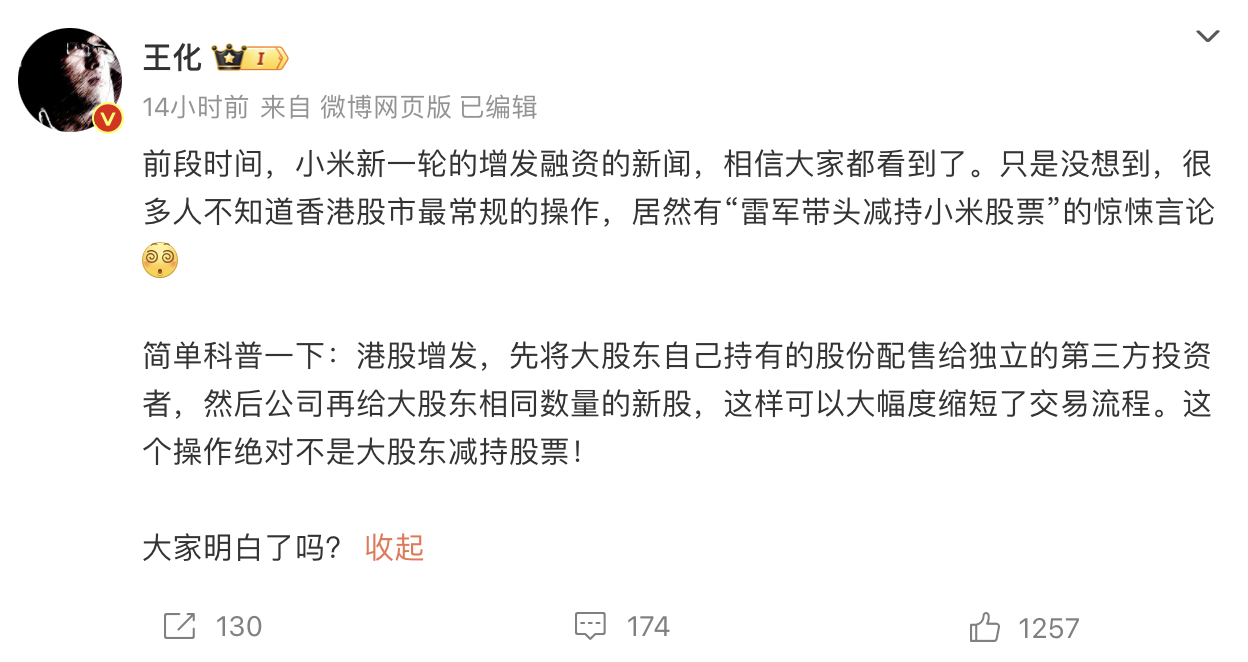 据了解,小米公关部总经理王化在微博评论称,“很多人不知道香港股市最常规的操作,居然有雷军带头减持小米股票的惊悚言论”。