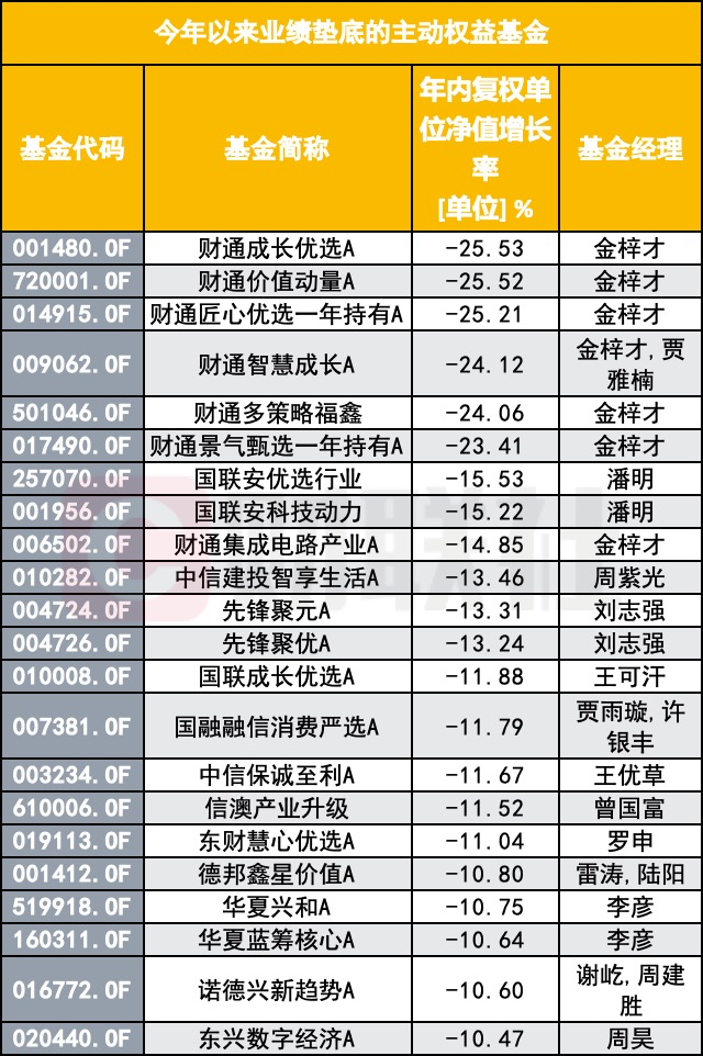 今年以来业绩倒数第一的是金梓才管理的财通成长优选,净值跌幅为25.53%,不仅如此,同是金梓才管理财通价值动量、财通匠心优选一年持有、财通智慧成长、财通多策略福鑫、财通景气甄选一年持有,净值跌幅均超过20%,他管理的财通集成电路产业也跌去14.85%。