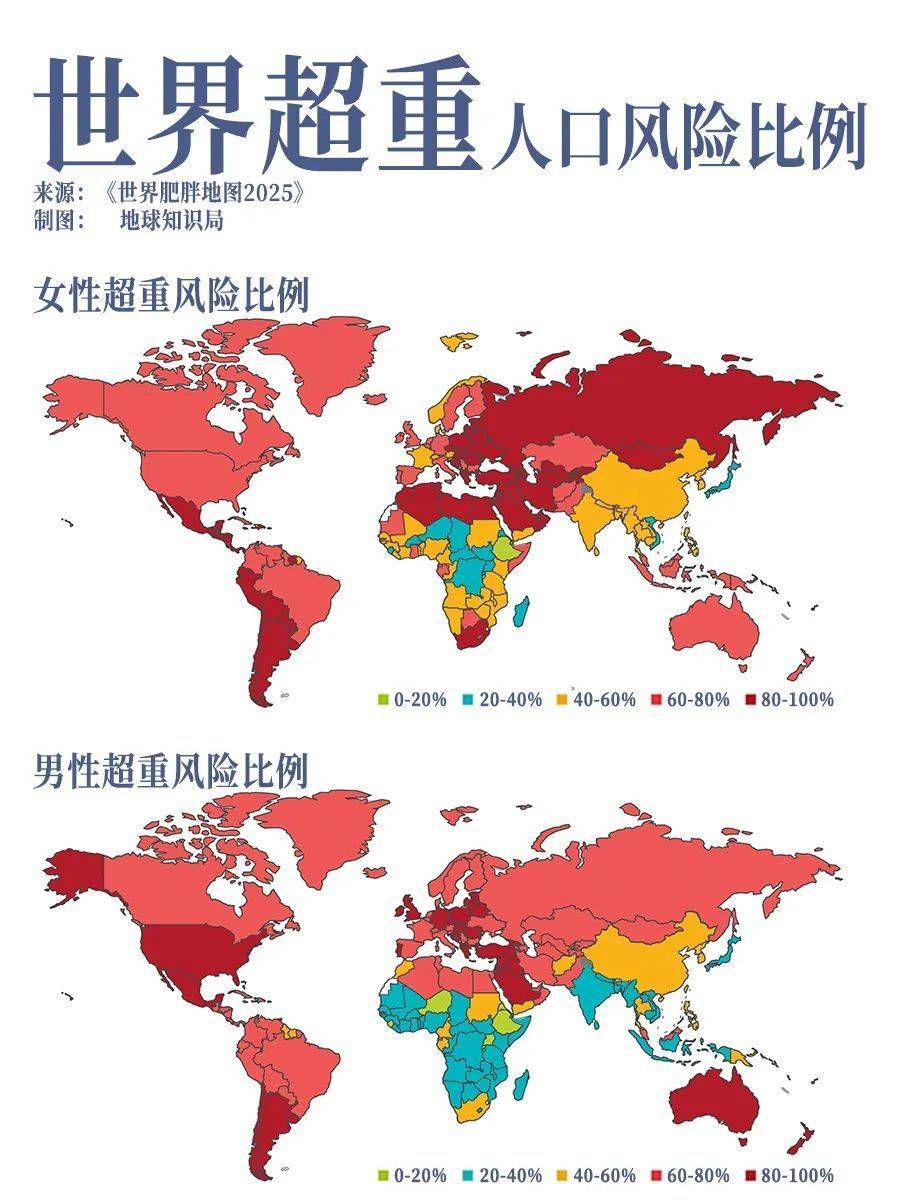 再看《世界肥胖地图2025》上的世界超重肥胖风险地图,会发现大多数发达国家都比较胖。