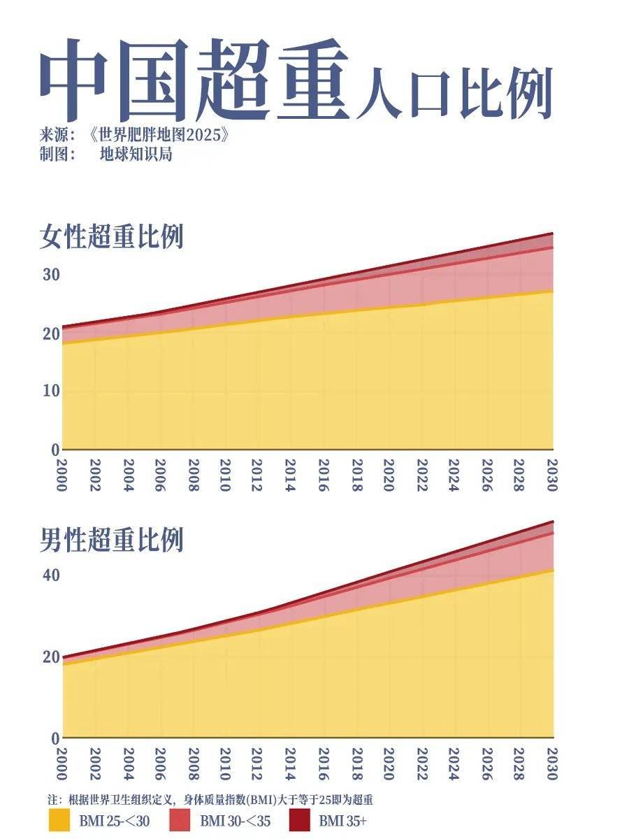 按照《世界肥胖地图2025》的估计,中国超重或肥胖成年人的比重还会继续增长,但它的预测还是比较温和。