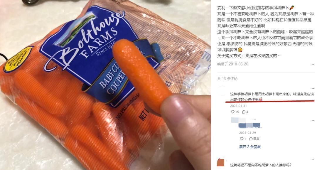 比如白领工位下午茶的常客之拇指胡萝卜,各个小巧精致可爱,盒马山姆全家等线下渠道都有售卖,盒马一袋138克卖到7.58元,普通胡萝卜400克也才1.55元,胡萝卜变小单价翻了14倍,你以为这是什么中产新品种,结果在袋子上看到:“物理鲜切打磨完成”。