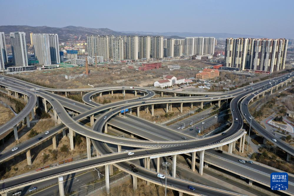 车辆在太原市北中环桥上行驶(2月20日摄,无人机照片)。