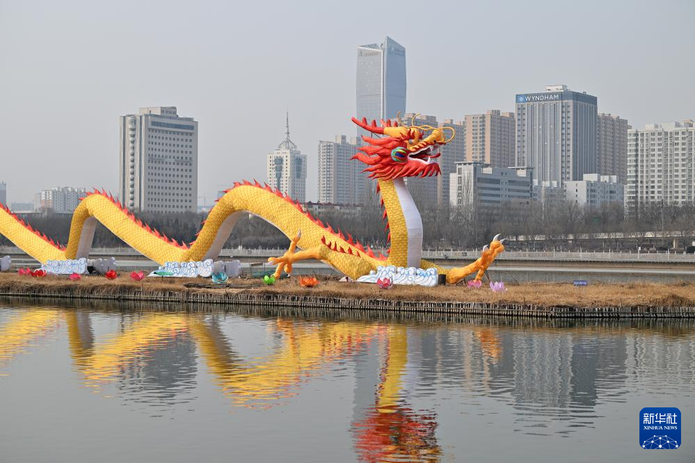 这是太原市汾河上的龙形彩灯(2月21日摄)。