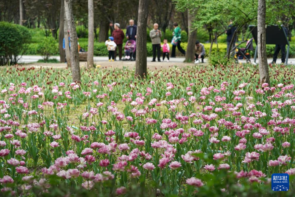 游人在太原市迎泽区迎泽公园赏花(2023年5月10日摄)。
