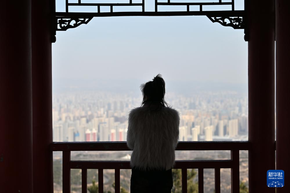 游人在太原市万柏林区启春阁欣赏风景(2月18日摄)。
