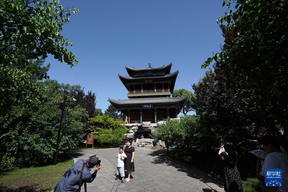 游客在太原市晋祠公园拍照(2023年7月4日摄)。
