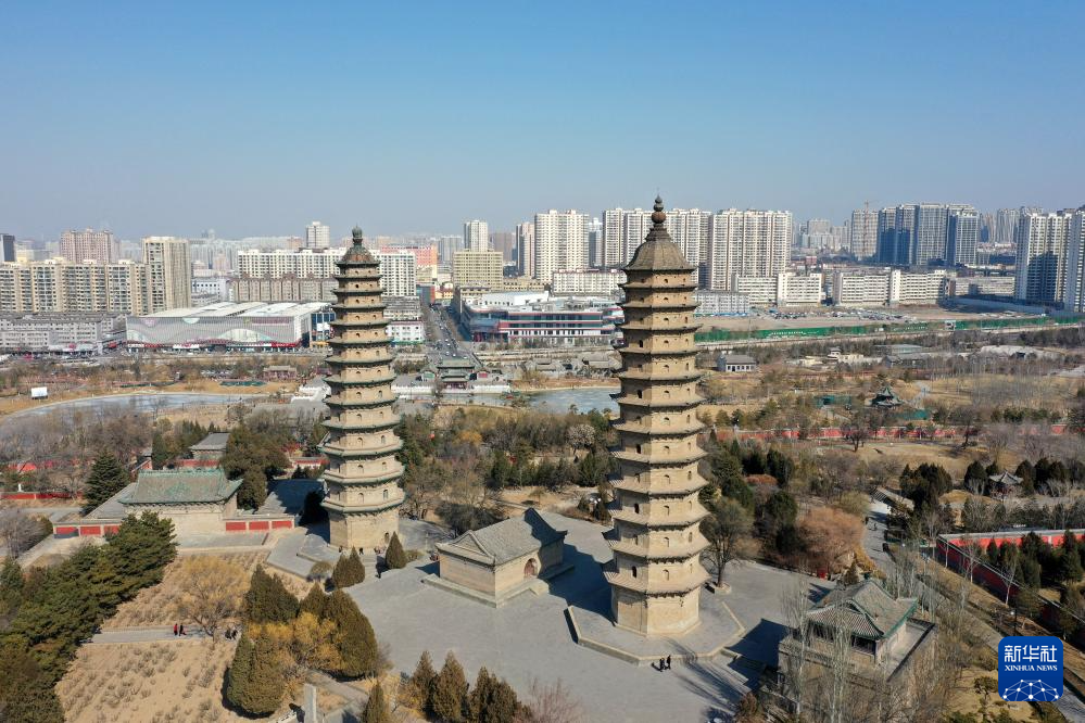 这是太原市永祚寺双塔(2月18日摄,无人机照片)。