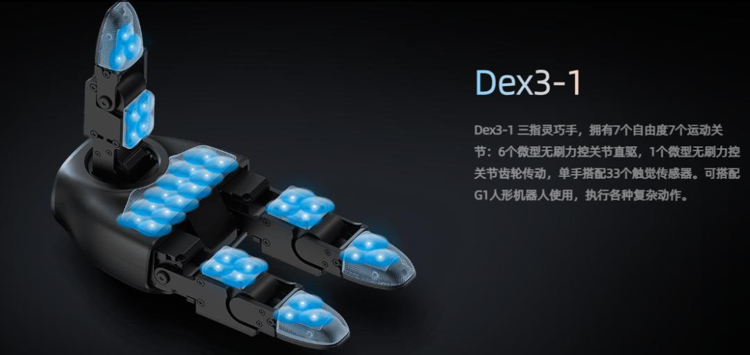 去年5月份宇树发布的第一代产品Dex3-1三指灵巧手,具有7自由度,重量45g,负载0.5-20kg,能够完成完成简单抓取、放置任务,视频展示了舞棍、开可乐、砸核桃等动作,适用于家庭、工业场景。