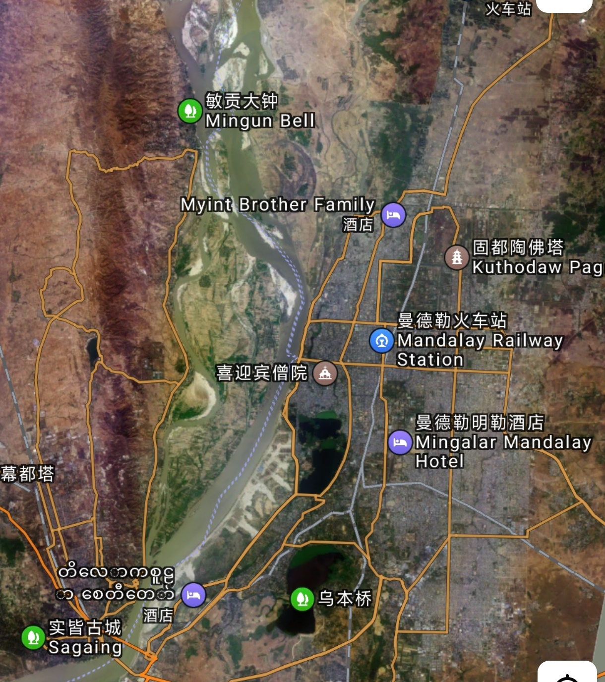 高德地图内部人士称,使用者在高德地图APP和高德地图网页版中切换至“卫星地图”图层,即可实时查看震中区域的曼德勒市以及周边城市的灾后遥感影像。