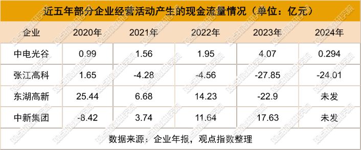 一般情况下,传统的产业企业以“开发贷-销售回款-再投资”的高杠杆循环运营,这也导致经营性现金流常年为负,如张江高科该科目自2021年起已经开始进入负值阶段,2024年较2023年略有上升,升幅为13.8%。