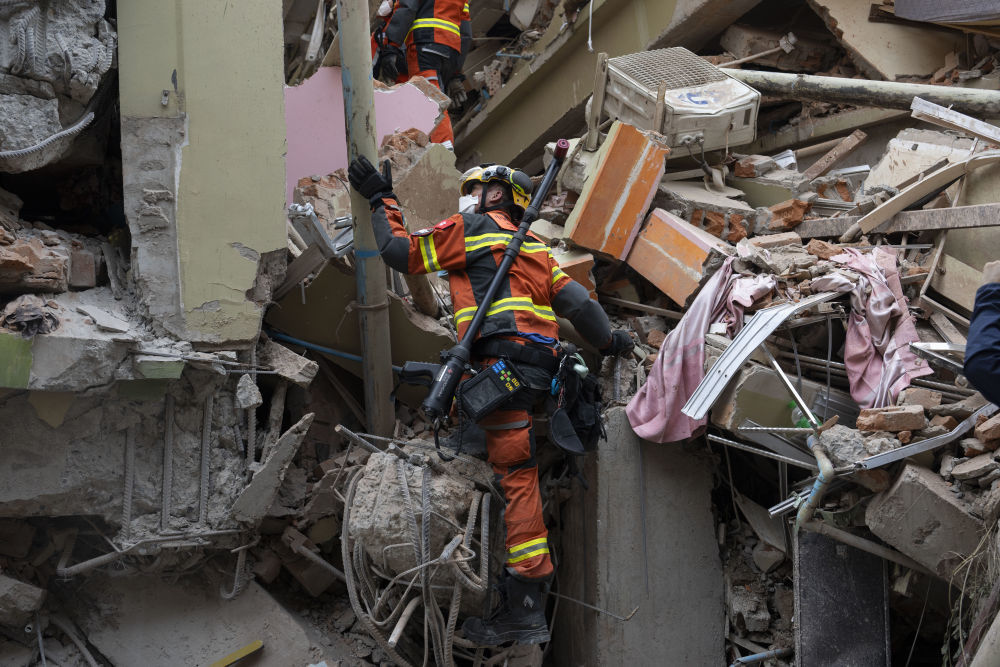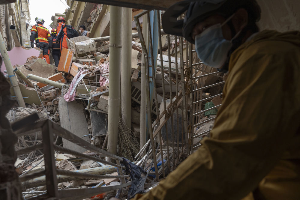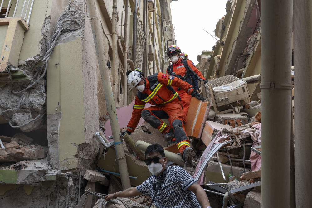3月28日,缅甸发生强烈地震。位于曼德勒市区的天空公寓为三栋11层的公寓楼群,其中两座完全坍塌,另一座楼体5层以下发生坐沉垮塌。连日来,中方救援队已在天空公寓开展多轮搜救。